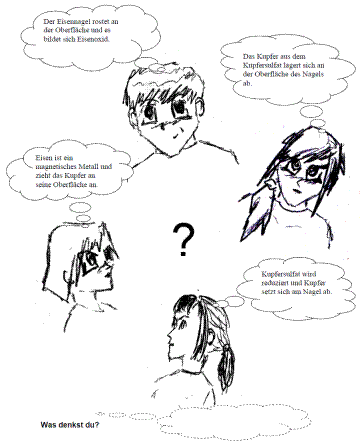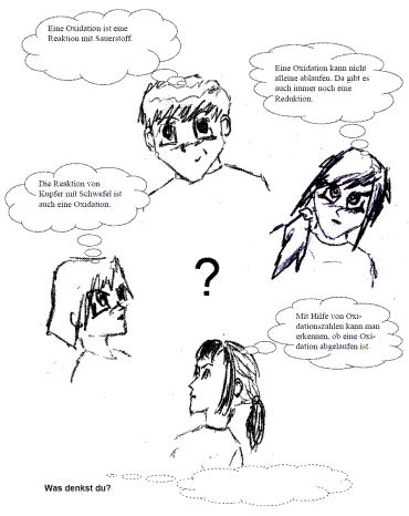zu ermitteln, werden entsprechende Aussagen in die Sprechblasen der Charaktere eingetragen und den Schülern präsentiert. Im Folgenden werden die Lernenden aufgefordert, dazu Stellung zu beziehen. Ein Vergleichen der verschiedenen Aussagen kann dabei auch in eine Diskussion im Plenum münden. Die gedankliche Beschäftigung sensibilisiert und aktiviert die Schüler dabei, sich intensiv mit den Aussagen und deren Richtigkeit zu beschäftigen. Der Lehrer erhält einen Überblick über die Präkonzepte seiner Schüler. Rechts ist ein möglicher Concept Cartoon für die Begrifflichkeit „Oxidation“ dargestellt (Vorlage aus [5]).