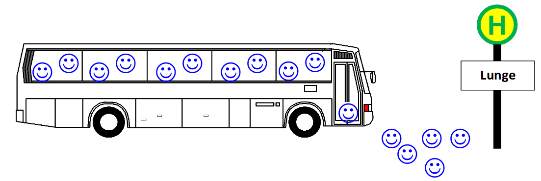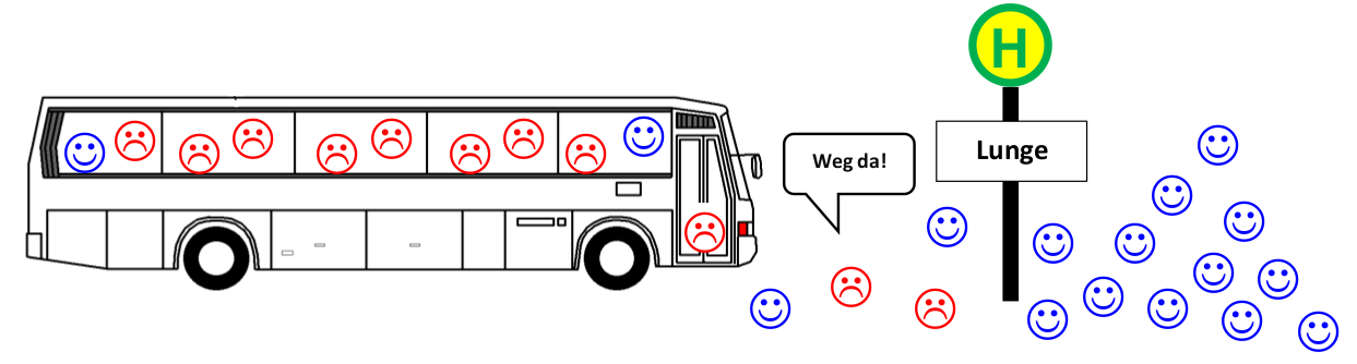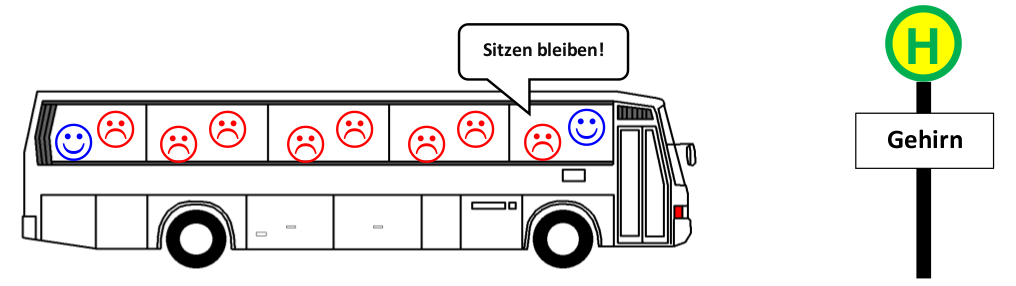 Hämoglobin-Teilchen (der Bus) im Blut sind zuständig für den Transport von Sauerstoff-Teilchen (lachende Smileys) im Organismus von der Lunge weg zu den anderen Organen des Körpers.