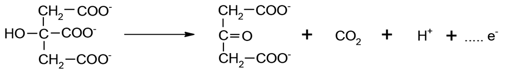 Das Citrat-Ion wird bei dieser Reaktion schrittweise unter Abspaltung von Kohlenstoffdioxid und einem Proton oxidiert. Im ersten Schritt entsteht dabei Acetondicarboxylat.- Ermitteln Sie die Anzahl der bei dieser Oxidation entstehenden Elektronen!