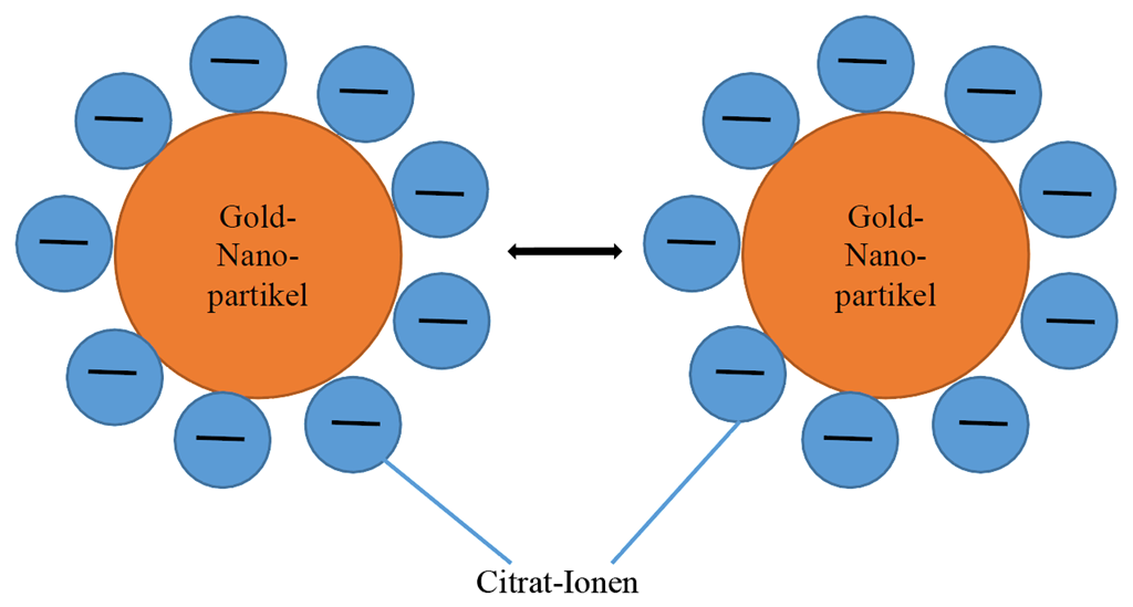 Neben seiner Funktion als Reduktionsmittel haben die Citrat-Ionen auch einen Einfluss auf die Größe der Gold-Nanopartikel. Die nicht umgesetzten Citrat-Ionen lagern sich an die Oberfläche der Gold-Nanopartikel an. Dadurch werden die Nanopartikel an ihrer Oberfläche negativ aufgeladen. Die dadurch wirkenden Abstoßungskräfte verhindern ein Verklumpen der Nanopartikel (s. Abb.).