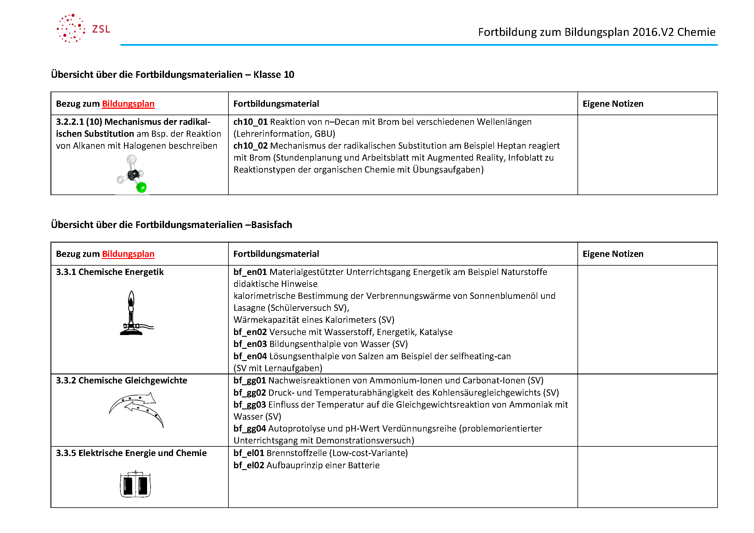 Das hier veröffentlichte Fortbildungsmaterial soll Ihnen helfen, für die neu hinzugekommenen Themen konkrete und direkt umsetzbare Anregungen und Ideen für Ihren eigenen Chemieunterricht zu entwickeln. Viele Materialien liegen auch in editierbaren Dateiformaten vor, so dass Sie diese selbst individuell an die Bedürfnisse Ihres Unterrichts anpassen und verändern können.