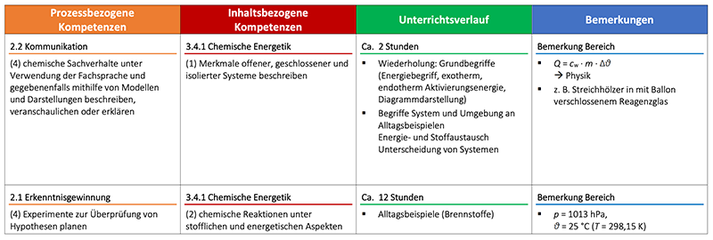 Das in der Mittelstufe nur qualitativ eingeführte Energie-Konzept bei chemischen Reaktionen wird in der ersten Einheit „Chemische Energetik“ vertieft und erweitert. Durch die hier gewählte Reihenfolge als Einstiegsthema ergeben sich Möglichkeiten zur Wiederholung von Grundbegriffen der Chemie an einfachen chemischen Reaktionen im Kontext der Energetik (Einrichten von Reaktionsgleichungen, Redoxreaktionen: Verbrennungsenthalpie; Säure-Base-Reaktionen: Neutralisationsenthalpie). Das Verständnis von Experimenten als Teil naturwissenschaftlicher Erkenntnisgewinnung wird durch Demonstrationsexperimente und Praktika ausgebaut (komplexere Experimente zur Kalorimetrie, reflektierte Optimierung von Versuchsanordnungen, genaues experimentelles Arbeiten, Messen). Quantitatives Arbeiten unter Verwendung bereits eingeführter Größen kommt verstärkt zum Tragen. (Verwendung von Grundgrößen zum stöchiometrischen Rechnen: Masse, Volumen, Stoffmenge, Dichte, molares Volumen, Molare Masse, Anteile und Konzentrationen). Auf diese Weise knüpft der Chemieunterricht an die bereits in Klasse 8 – 10 erworbenen Kompetenzen an. Andererseits werden typische Merkmale des Kursstufenunterrichts wie anspruchsvollere experimentelle Zugänge, verstärkt quantitatives Arbeiten, eigenständige Versuchsplanungen oder ein zunehmend höherer Abstraktionsgrad der verwendeten Modelle von Beginn an deutlich sichtbar.