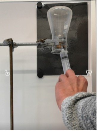 - Spannen Sie den Erlenmeyerkolben mit der Öffnung nach unten im Stativ ein (ca. 40cm hoch, siehe Abbildung rechte Seite)