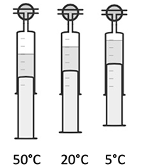 - Der Versuch wird erneut durchgeführt, diesmal mit Wasser der Temperatur von ca. 50 °C Anschließend wird der Versuch mit Wasser der Temperatur von ca. 5 °C wiederholt.