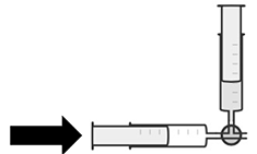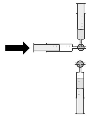- Der 3-Wege-Hahn wird verschlossen und die leere Spritze wird abgeschraubt. Durch vorsichtiges Schütteln wird das Gas nach und nach im Wasser gelöst.