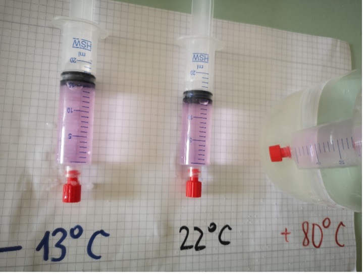 - Stellen Sie eine der Spritzen in ein Becherglas mit heißem Wasser, die andere Spritze in ein Becherglas mit einer Kältemischung. Die dritte Spritze wird vor einem weißen Hintergrund als Vergleich bereitgehalten.