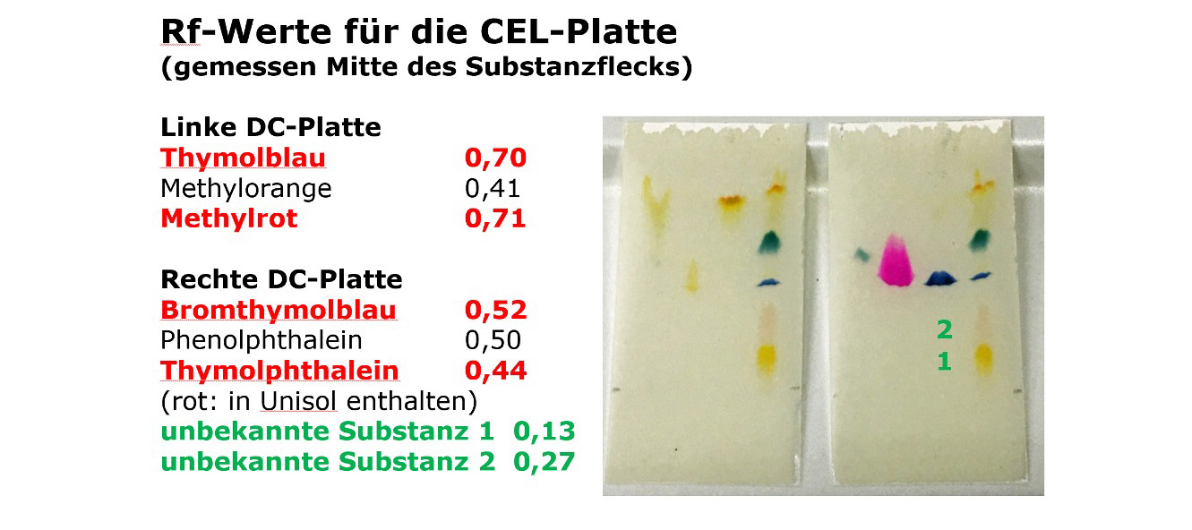 Es sind mindestens zwei weitere Substanzflecken aufgetrennt worden, die nur eine geringe Laufstrecke zurückgelegt haben (kleiner Rf-Wert). Diese Substanzflecken sind keinem der untersuchten Indikatorfarbstoffe zuzuordnen.