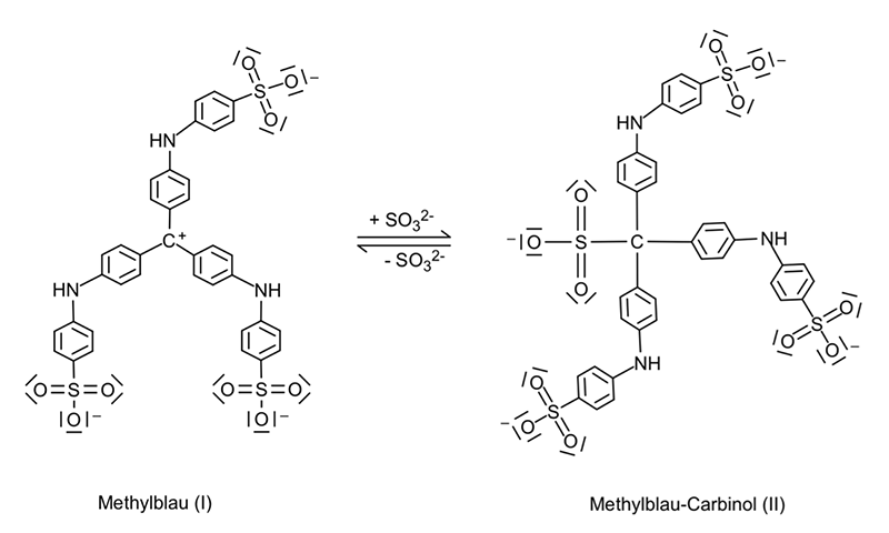 Sulfit-Ionen können reversibel an das Methylblau addieren. Dabei bildet sich Methylblau-Carbinol. Im leicht alkalischen Bereich (pH = 7,4) liegt das Gleichgewicht stark auf der rechten Seite, sodass die Lösung olivgrün erscheint.