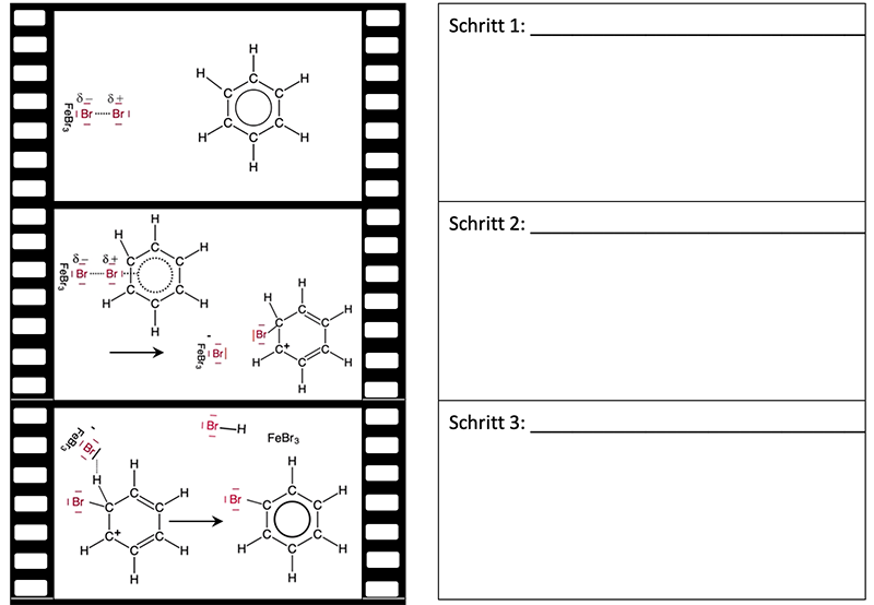Die Ergebnisüberprüfung der Beschreibung erfolgt mit einer LearningApp (M 2), in der Textbausteine in die richtige Reihenfolge zu bringen sind. Im Lehrer-Schüler-Gespräch wird abschließend begründet, dass die Reaktion von Benzol mit Brom eine elektrophile Substitution ist.
