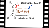 Die hohe Elektronendichte der C=C-Doppelbindung führt zu einer Polarisierung der Elektronenpaarbindung im Brom-Molekül. Hierdurch wird dieses zu einem induzierten Dipol. |