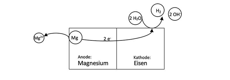 Durch den Kontakt des Magnesiums mit dem Eisen fließen die bei der Oxidation von Magnesium frei werdenden Elektronen durch das edlere Metall Eisen in das Wasser.