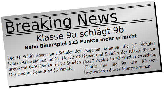 schreibeZeitungsmeldung()richtig.Die Klasse 9b fühlt sich ungerecht behandelt, da sie der Meinung ist, im Durchschnitt viel besser gewesen zu sein. Um die Behauptung bestätigen zu können, musst du eine Methode