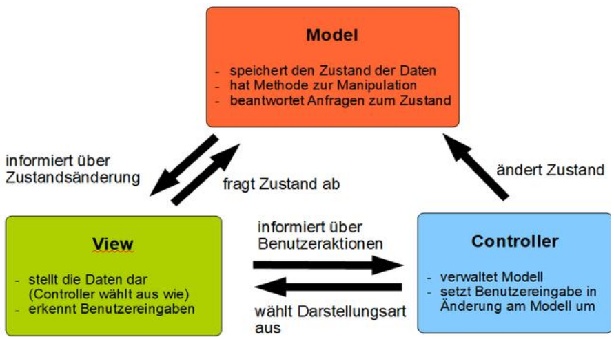 Bildquelle: MVC-Softwaremuster von ZPG/PG Fach [CC BY-SA 4.0 DE], aus Hintergrund GUI-Programmierung, bearbeitet