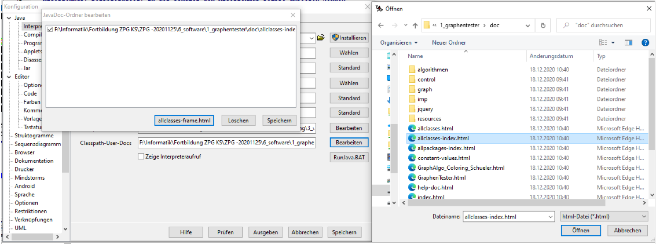 Möchten Sie auch die Hilfefunktion des Java-Editors für die mitgelieferten Klassen nutzen, damit die Schüler beim Programmieren unterstützt werden, müssen Sie in der Konfiguration des Java-Editors den Classpath-User-Docs ergänzen. Wählen Sie im Unterverzeichnis "doc" des Graphentesters die Datei "allclasses-index.html" aus.