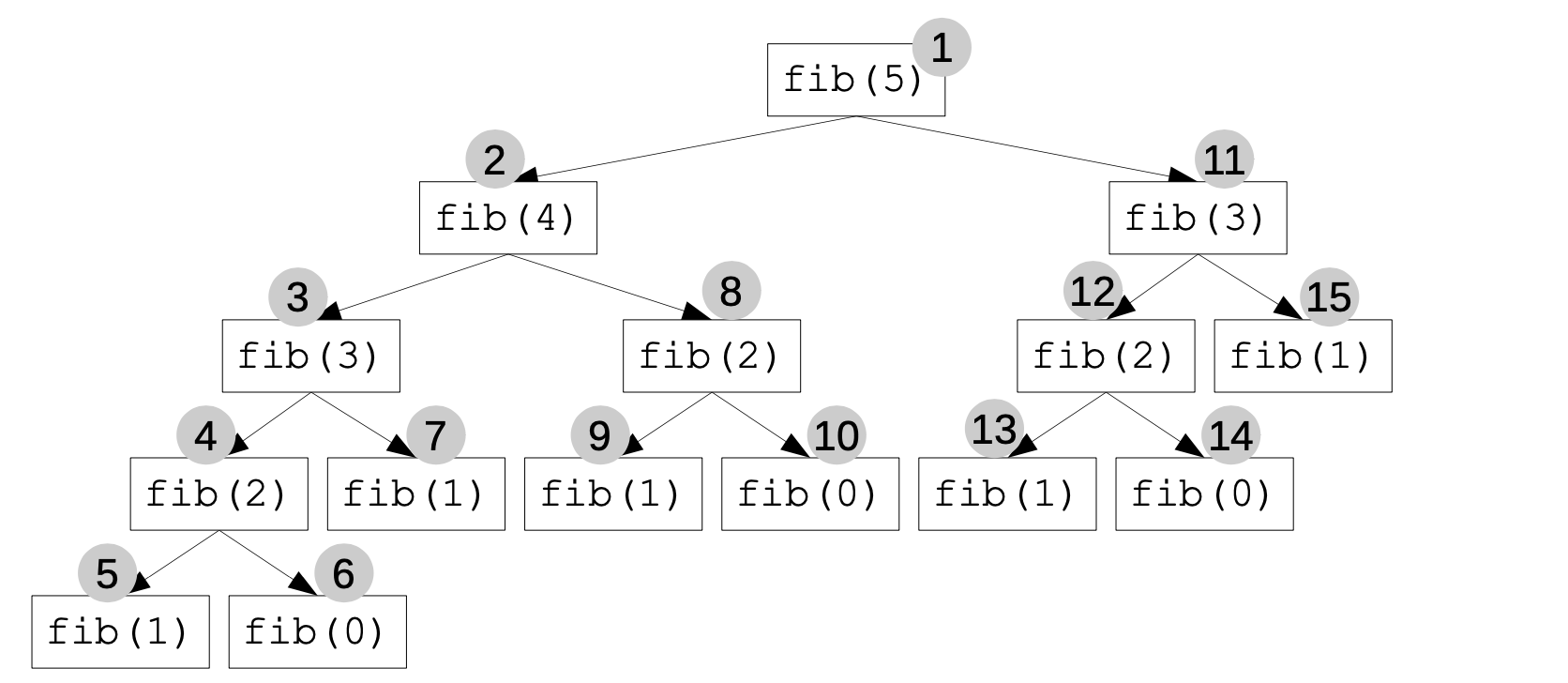 Der Rekursionsbaum zeigt auch sehr schön, dass die rekursive Implementation der Fibonacci-Funktion wenig effizient ist, da immer wieder die gleichen Teilbäume entstehen. Eine bessere Technik wäre entweder eine iterative Implementation oder die Verwendung von dynamischer Programmierung bzw. Memoisation23 :
