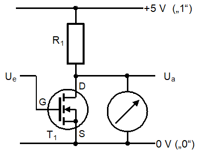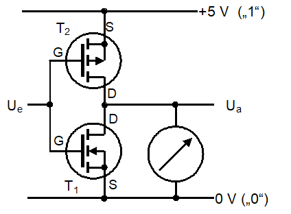 Ist Ue dicht bei 0 Volt, dann ist wie zuvor der Drain-Source-Widerstand von T1 sehr groß. Hingegen ist dieser Widerstand in T2 sehr klein, weshalb das Potenzial am Ausgang Ua dicht bei 5 Volt liegt. Ist jedoch Ue dicht bei 5 Volt, dann leitet der Drain-Source-Kanal von T1 sehr gut, während der von T2 nahezu isoliert. Dies führt bei Ua zu einem Potenzial dicht bei 0 Volt. Mithin hat diese Schaltung genau dieselbe Wahrheitswert-Tabelle wie die bipolare NOT-Schaltung von oben: