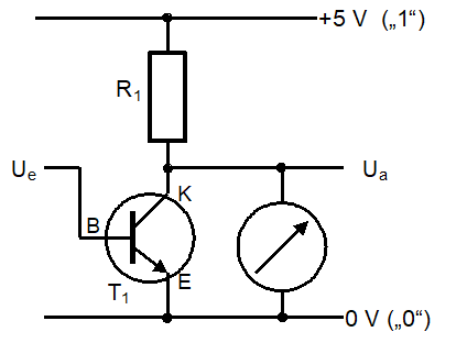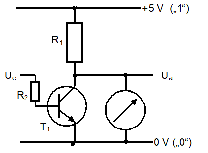 - Ist umgekehrt das Potenzial von Ue dicht bei 5 Volt, dann fließt über den Widerstand R2 ein hinreichend großer Basisstrom in den Transistor, so dass seine Kollektor-Emitter-Strecke niederohmig wird. Das Potenzial von Ua sinkt bis dicht an 0 Volt ab.