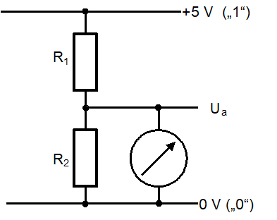 Je nach Wahl der Werte für die zwei Widerstände R1 und R2 erhält man bei Ua jeden gewünschten Potenzialwert zwischen 0 und 5 Volt. Ist R1 >> R2, dann liegt das Potenzial am Ausgang dicht bei 0 Volt, was wir als eine logische „0“ interpretieren wollen. Ist umgekehrt R1 << R2, dann liegt der Potenzial am Ausgang dicht bei 5 Volt (logische „1“).