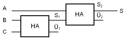 Der Ansatz, aus der Wahrheitswerttabelle die Schaltung zu entwickeln, erinnert an die „Brute-Force-Methode“. Geschickter ist hier die Anwendung eines „Divide-and-Conquer“-Ansatzes: man zerlege das Problem in kleinere Einzelprobleme, löse diese und versuche dann, die Lösung des ursprünglichen Problems aus den Einzellösungen zusammenzusetzen. Zumindest die Zerlegung geht im vorliegenden Fall sehr einfach: statt eine Addition dreier Bits „in einem Rutsch“ zu betrachten, nehmen wir zuerst mal zwei der Bits und addieren diese. Dann addieren wir zum Zwischenergebnis das dritte Eingangsbit. Eigentlich müssen wir also nur zwei Halbaddierer hinter einander schalten: