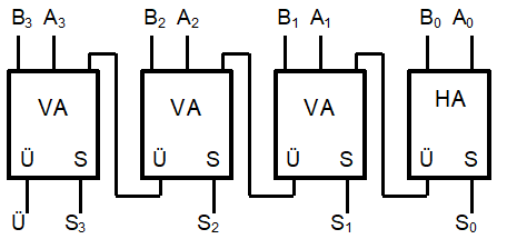 Eine Schaltung zur Addition zweier 4-Bit-Binärzahlen könnte dann entsprechend so aussehen: