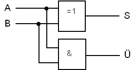 Die ersten 3 Zeilen stellen kein Problem dar: solange das Ergebnis der Elementar-Addition einstellig ist, ist die Welt in Ordnung. Schwieriger wird es in der vierten Zeile: dort liegt ein zweistelliges Ergebnis vor, was einen Übertrag 1 in die nächst-höherwertige Stelle zur Folge hat. Bei den ersten drei Rechnungen hat der Übertrag hingegen stets den Wert 0. Zur Bewältigung der Addition zweier einstelliger Binärzahlen brauchen wir also eine Schaltung mit 2 Eingängen A und B sowie zwei Ausgängen S (für den Stellenwert) und C (Carry, englisch für den Übertrag). Diese Schaltung muss die folgende Wahrheitswert-Tabelle haben: