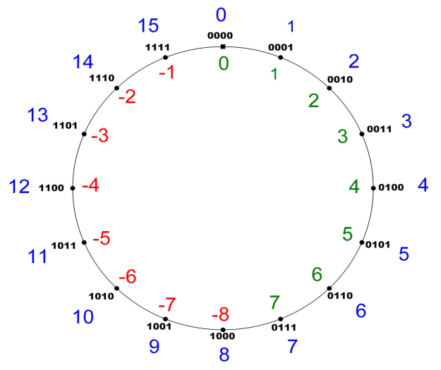 In einer solchen zyklischen Anordnung ist die Interpretation der Bitmuster als rein positive ganze Zahlen nicht mehr zwingend. Man könnte auch eine Hälfte der Zahlen als positive und die andere Hälfte als negative Zahlen ansehen. Da in der Menge der ganzen Zahlen die 0 den Vorgänger -1 hat, müsste dieser Zahl das Bitmuster „1111“ entsprechen, der -2 das Muster „1110“. Üblicherweise wird das höchstwertige Bit als Vorzeichen-Indikator genommen: alle Bitmuster der Form „1xxx“ werden als negativ interpretiert, alle der Form „0xxx“ als positiv. Die sich damit ergebende Zuordnung ist im folgenden Diagramm durch den zusätzlichen inneren Zahlenkreis dargestellt: