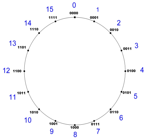 Addiert man zu 1111b = 15 nun nochmals eine 1, dann erhält man 10000b = 16, was aber 5 Bits zur Speicherung braucht und daher nicht mehr in ein 4-Bit-Wort passt. Schreibt man dieses Ergebnis dann eben „soweit es geht“ stellengerecht in einen 4-Bit-Speicher, dann erhält man als Resultat dieser Addition das Bitmuster „0000“. Mithin erscheint der Zahlenraum zyklisch geschlossen: