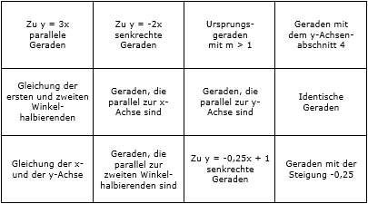 Anschließend ziehst du jeweils ein Eigenschafts- und ein Geradenkärtchen. Haben die Geraden auf der gezogenen Geradenkarte die gleichen Eigenschaften wie auf der gezogenen Eigenschaftskarte, so gehören die Karten zusammen. In diesem Fall darfst du die Karten behalten. Gehören die Karten nicht zusammen, legst du sie wieder mit der beschriebenen Seite nach unten zurück. Wer die meisten Kartenpaare erspielt hat, gewinnt das Spiel.