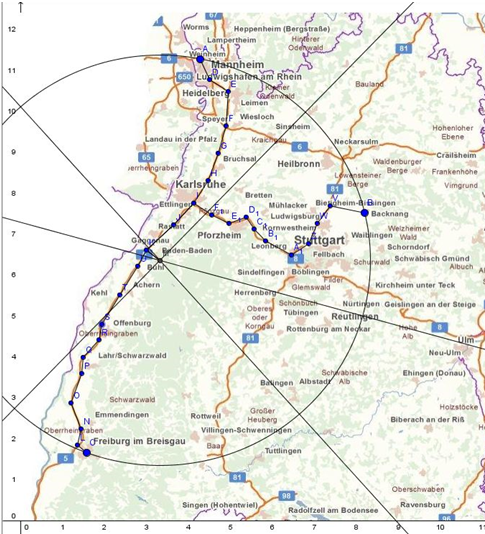 Beispielsweise erhält man mit den unten eingetragenen Streckenzügen und Bühl als Treffpunkt, dass Frau Nöbel aus Freiburg und Herr Laschinger aus Mannheim ungefähr gleich weit fahren müssten, während Frau Yildiz aus Backnang einen weiteren Anfahrtsweg hätte.