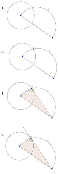 - Zeichne die Strecke P-M von P zum Mittelpunkt M des Kreises k ein und konstruiere einen Halbkreis h durch die beiden Punkte P und M.