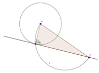 d) Betrachtet man den anderen möglichen Halbkreis über den beiden Punkten P und M, so findet man einen weiteren Berührpunkt und die entsprechende Gerade (siehe Bild unten).