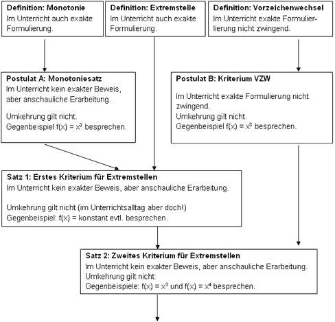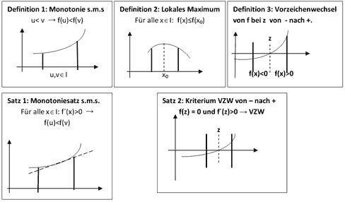 Man könnte auch die betrachteten Funktionen einschränken auf zum Beispiel „Funktionen mit endlich vielen Extremstellen“, womit die pathologischen Beispiele der oszillierenden Funktionen aus dem Spiel wären. Das würde aber in der Regel für die Schule zu weit führen. 5) Hier noch eine Begründungsbasis, wie sie im Unterricht in Form von Plakaten verwendet werden kann. (Für Monotonie und Extremstellen ist jeweils nur ein Beispiel angegeben).