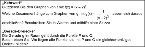 Die Aufgaben sind formal vorgegeben. Eine Antwort wird in verbaler Form eingefordert und muss / kann durch eine entsprechende Skizze ergänzt werden.