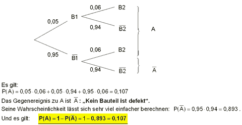 Eine Maschine besteht aus zwei Bauteilen. Aus vielen Kontrollen weiß man, dass ein Bauteil mit der Wahrscheinlichkeit 0,05, das andere mit der Wahrscheinlichkeit 0,06 defekt ist. Die Maschine wird nicht ausgeliefert, wenn mindestens ein Bauteil defekt ist. Wie groß ist die Wahrscheinlichkeit für das Ereignis