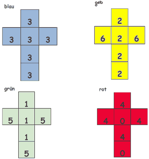 Auf dem Tisch liegen 4 Würfel mit den abgebildeten Netzen (Efron-Würfel).