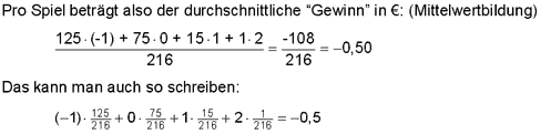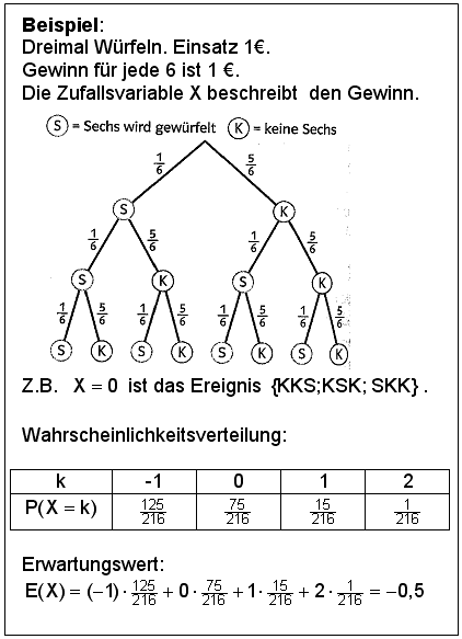 Da man den durchschnittlichen Gewinn auf lange Sicht etwa erwarten kann, nennt man ihn Erwartungswert E(X) für den Gewinn X.