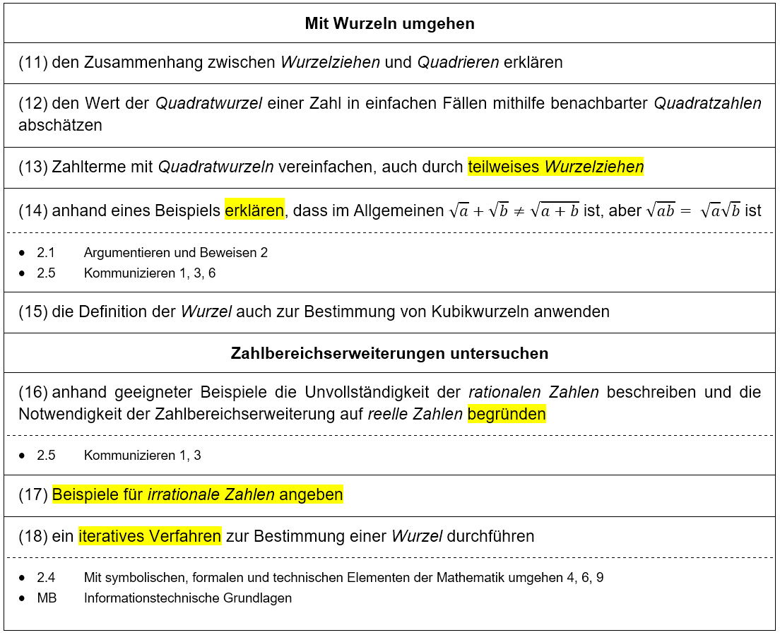 Neu gegenüber dem alten Bildungsplan sind zunächst die explizit aufgeführten Fähigkeiten des teilweisen Wurzelziehens, des Durchführens eines iterativen Verfahrens und des Angebens irrationaler Zahlen (womit nicht nur Wurzeln gemeint sind). Außerdem sollen die Regeln des Wurzelrechnens nicht nur beherrscht, sondern auch an einem Beispiel erklärt werden können, die Zahlbereichserweiterung auf reelle Zahlen soll nicht nur als notwendig erkannt, sondern auch begründet werden. Alle diese Änderungen sind im grundlegenden und mittleren Niveau nicht verlangt und damit charakteristisch für das erweiterte Niveau und damit für das Gymnasium.
