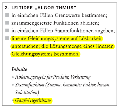 Das Gaußverfahrenals Lösungsverfahren zu linearen Gleichungssystemen wird erst im Bildungsplan der Kursstufe zum Basisfach und im Bildungsplan 2004 zum Leistungsfach angesprochen.