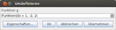 Die Eingabe Funktion[-x²+2, -1.7, 1.7] schränkt die Funktion f mit f(x)=x²+2 auf das Intervall [-1.7 , 1.7] ein. Beim zweiten Beispiel ist die Funktion g auf das Intervall [-2 , 2] eingeschränkt.