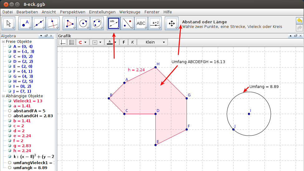 Bei Abständen sind mindestens zwei Punkte oder eine geschlossene Strecke nötig. Im gleichen Beispiel wie zuvor kann der Abstand zwischen zwei beliebigen Punkten gemessen werden, indem man die Punkte nacheinander anklickt. Die Länge einer Strecke misst man mit einem Klick auf dieselbe (vgl. Abbildung 3). Bei Formen oder Figuren kann auch der Umfang bestimmt werden, ohne zuvor alle Einzelstrecken aufsummieren zu müssen. Bei Figuren muss man dabei in die Figur klicken, als würde man den Flächeninhalt bestimmen wollen. Bei Formen, wie beispielsweise einem Kreis, muss man auf die Kreislinie klicken, da innerhalb des Kreises keine Fläche erkannt wird (vgl. Abbildung 4).