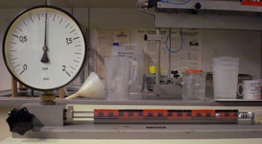 Durch Einblasen von Druckluft an dem Anschluss auf der linken Seite bewegt sich die Kugel nach rechts und verringert das Volumen auf der rechten Seite. Dadurch steigt der Druck an. Die Temperatur während des Versuchs ist konstant.
