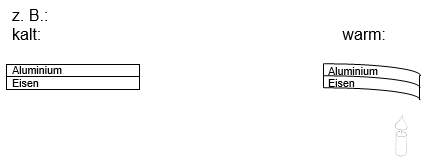 Im obigen Beispiel dehnt sich Aluminium stärker aus als Eisen. Da die Metalle aber zusammengenietet sind, krümmt sich der Bimetallstreifen nach unten.