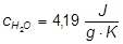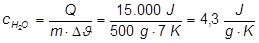 Die spezifische Wärmekapazität gibt an, wie viel Wärme (Energie) in Joule man benötigt, um 1 g eines bestimmten Stoffes um 1 K zu erwärmen. z. B. Wasser: Man benötigt 4,19 Joule an Energie (Wärme), um 1 g Wasser um 1 K zu erwärmen. (1 K wäre z. B. eine Erwärmung von 35 °C auf 36 °C oder von 0 °C auf 1 °C) |
