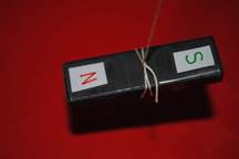 Hänge einen Stabmagnet mittig an einem langen Faden auf und beobachte das langfristige Verhalten des Stabes. In der Nähe des Magneten sollten sich dabei kein weiterer Magnet oder metallische Gegenstände befinden. Wiederhole den Versuch mit einem zweiten Stabmagneten.
