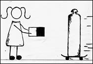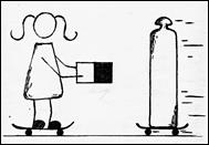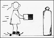 In den drei Bildern sind jeweils verschiedene Situationen dargestellt. Es befinden sich ein Mädchen mit Magnet und/oder ein Eisenblock auf einem reibungsarmen Rollbrett. Die sich ergebende Bewegungssituation ist durch den Fahrtwind markiert worden.