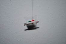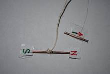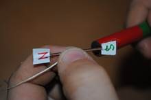 Hänge ein kurzes Drahtstück mittig an einem möglichst torsionsfreien Faden auf. Sehr gut eignet sich hierfür auch ein langes Haar, das mit einem Klebestreifen am Draht befestigt wird. Markiere die beiden Enden mit N (Nord) und S (Süd). Für die spätere Untersuchung von Magnetfeldern kann ein Pfeil zum Nordpol hin angebracht werden, wodurch die Feldlinienrichtung angezeigt wird. Streiche dann mehrfach mit dem Nordpol eines Stabmagneten an dem kurzen Draht entlang stets vom Nordpol zum Südpol hin. Der Draht ist damit magnetisiert und ein kleiner Kompass. Prüfe anschließend dessen Funktionstüchtigkeit: Richtet sich der Nordpol des aufgehängten Drahtes zum geografischen Nordpol oder zum Südpol eines Stabmagneten aus?