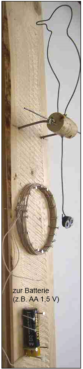 Aufgabe 1 Wie verhält sich der „Elektrospecht“ wenn man kurzzeitig den Stromkreis schließt? Der „Elektrospecht“ fängt an sich zu bewegen. Aufgabe 2 Welche Rolle spielt die Polung der Batterie? Der Magnet wird angezogen oder abgestoßen. Vertauscht man den Plus- und Minusanschluss an der Batterie, so verändert sich die Kraftrichtung auf den Magneten. Aufgabe 3 Erläutere die Funktionsweise. Der Draht ist kreisrund zu einer Spule gewickelt. Um stromdurchflossene Leiter und stromdurchflossene Spulen existieren Magnetfelder. Sobald Strom durch den kreisrund gewickelten Draht fließt bildet sich ein Magnetfeld aus, welches den Magneten anzieht oder abstößt. Ändert man die Stromrichtung, so dreht sich die abstoßende bzw. anziehende Wirkung auf den Magneten um. Das heißt, die Richtung des Magnetfeldes der Spule ist abhängig von der Stromrichtung. |