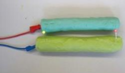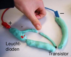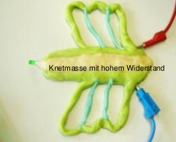 Forme eine Figur deiner Wahl mit mindestens einer Leuchtdiode. Zur Verfügung stehen zwei verschiedene Knetmassen, eine mit hohem und eine mit geringem Widerstand.