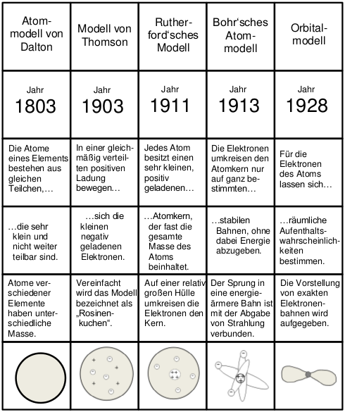Die Atommodelle und deren zugehörigen Aussagen, Daten und Bilder sind jeweils spaltenweise