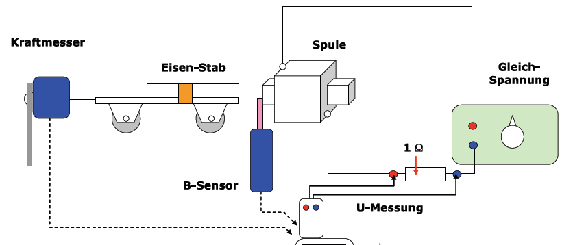 Aus dem Unterricht ist die Flussdichte als Funktion der Stromstärke und den Spulendaten bekannt. In gleicher Weise kann man davon ausgehen, dass die Kraft auf einen stromdurchflossenen Leiter in einem Magnetfeld der Flussdichte B bekannt ist. In der folgenden Teamarbeit wird ein Elektromagnet - also eine Spule mit Eisenkern untersucht. Über dem Elektromagneten hängt ein Eisenstück an einem Kraftsensor, das von dem Elektromagneten angezogen wird. Die Kraft wird in Anhängigkeit von der Stromstärke durch den Elektromagneten untersucht.